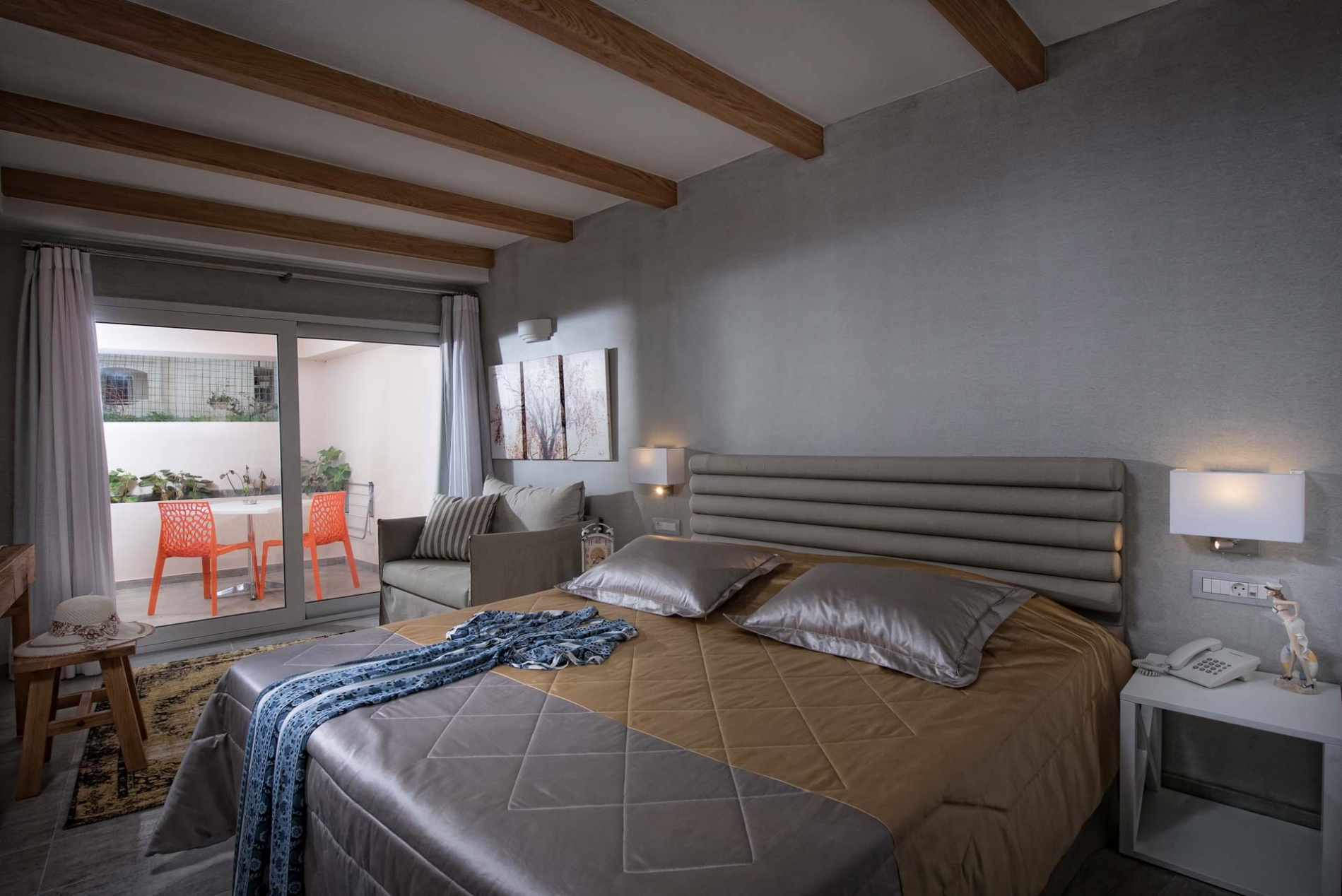 The Junior Suite eco is located at the semibasement is 20-25 sqm in size and designed to accommodate 2 persons. The room is furnished with armchairs and has a Smart Satellite TV 32, Wi-Fi, a kitchenette with refrigerator, and a safe for valuables. It is air-conditioned and veranda. The mattresses are selected for maximum relaxation to guarantee a restful night’s sleep. All Junior Suite services are offered at no extra cost.