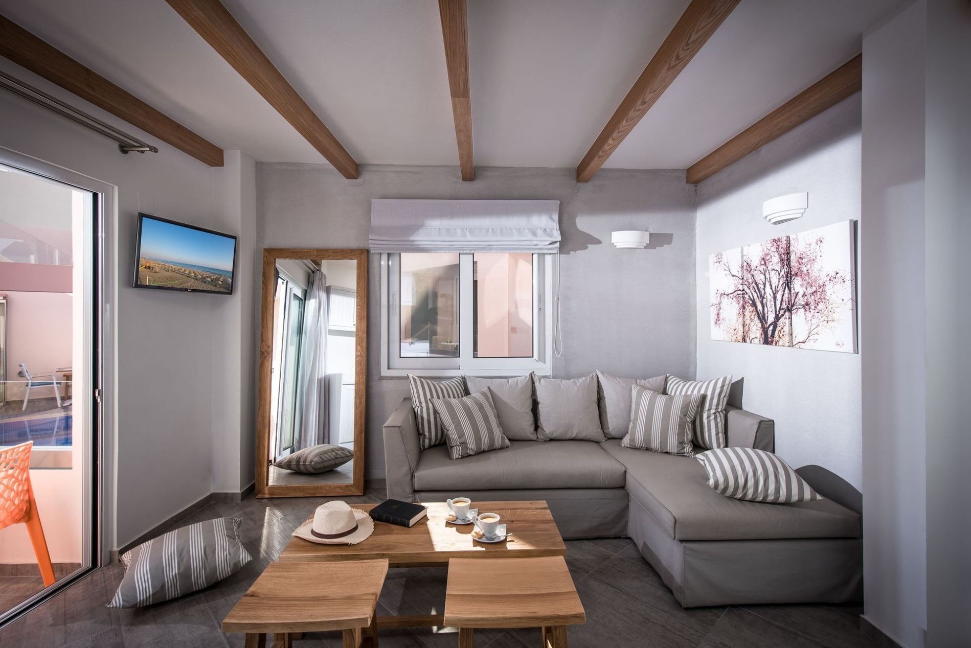 The 35 sqm One-Bedroom Suite is located in the semibasement and can accommodates up to 4 guests. Comprising a bedroom and a sitting-room, the suite is equipped with a Smart Satellite TV 32 in each room, Wi-Fi, a kitchenette with refrigerator, and a safe. It has air-conditioning in every room, a furnished terrace and a bathroom. One room of the suite is designed for 2 persons, and the couch in the other room can comfortably accommodate 2 additional guests. The mattresses are selected for maximum relaxation to guarantee a restful night’s sleep. All suite services are offered at no extra cost.